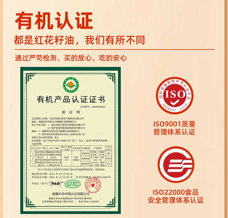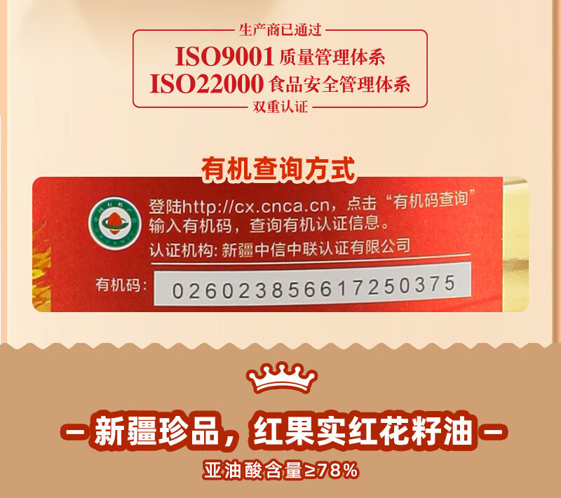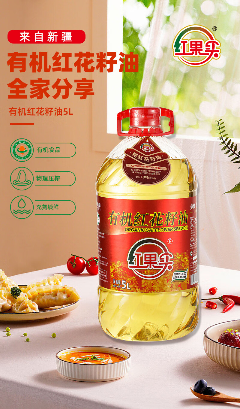 商品名称:红果实 新疆有机红花籽油5L食用油礼盒装 进口原料 物理压榨 高亚油酸